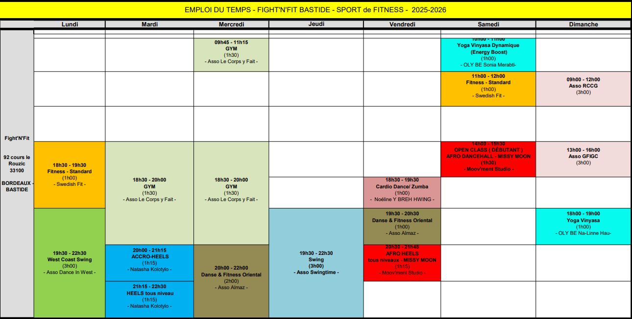 Planning des cours « Danse et fitness » à Fight’N’Fit Saison 2025-2026